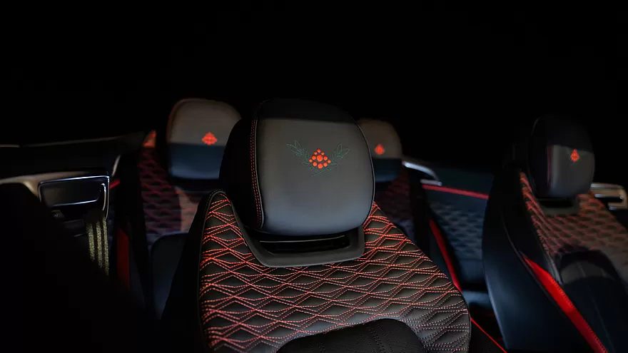 Інтер’єр перерахованих моделей оздоблений темною шкірою. Крім того, по всьому салону можна побачити червоні вставки, що перегукуються з елементами екстер’єру, а передня панель оброблена натуральним шпоном волоського горіха. На підголівниках сидінь є вишивка у вигляді зеленого листя папороті та червоних ягід.