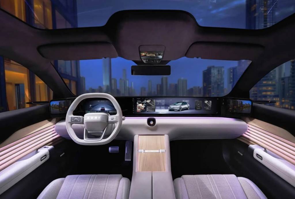 Усередині від стійки до стійки розтягнутий 59-дюймовий дисплей мультимедійної системи, що працює на базі чіпа Qualcomm Snapdragon 8295. Операційна система “своя” – Audi OS, а роль дзеркал заднього виду грають камери, що транслюють зображення на бічні частини екрану.