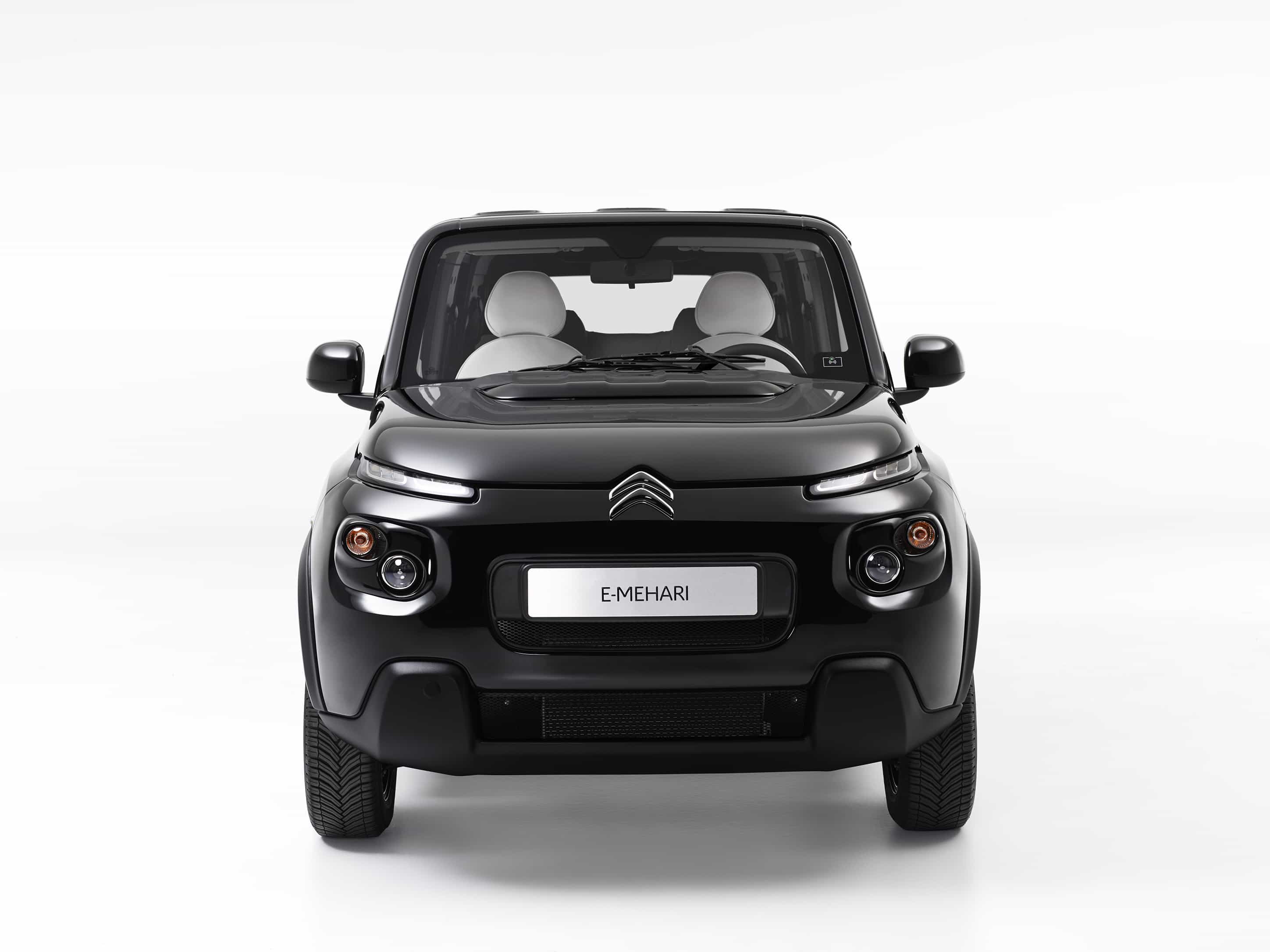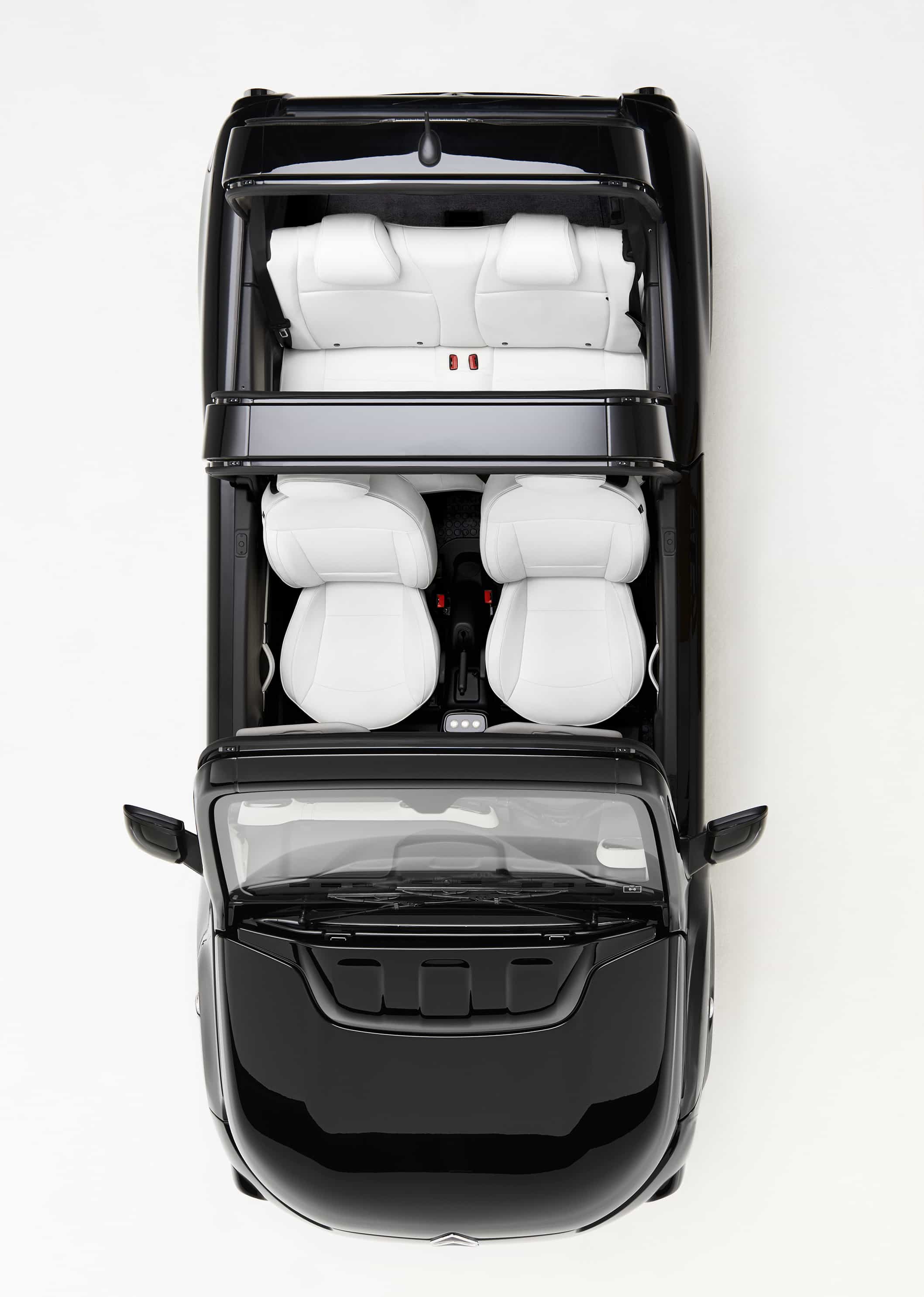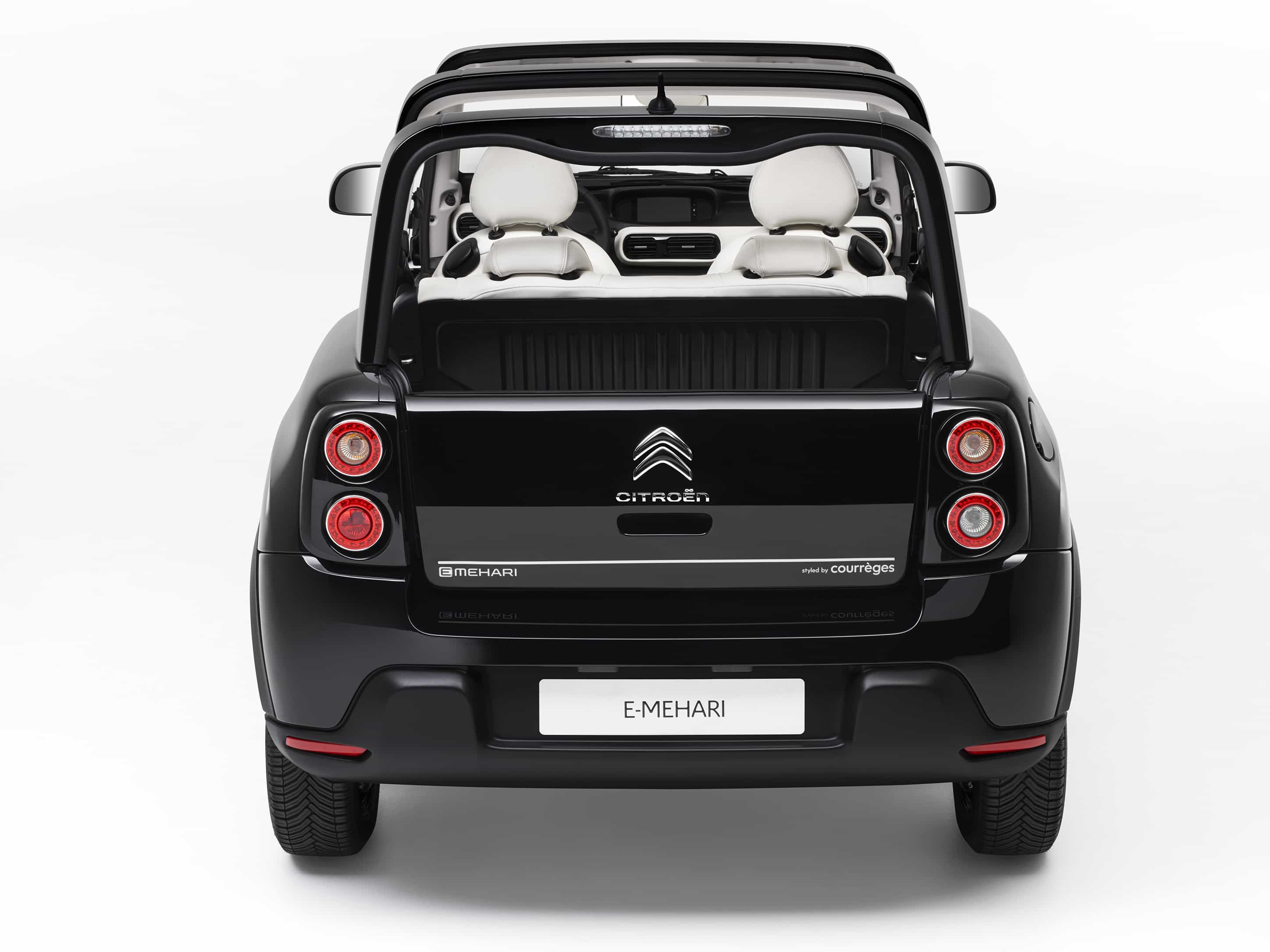 4-местный кабриолет Citroen E-Mehari “Styled by Courrèges” получил 15″ колесные диски “Give me five” с темной шлифованной отделкой и черный жесткий верх Hard Top. В противоположность одноименному концепту белого цвета, представленному ранее в Женеве, новинка выполнена черном цвете: кузов получил черное покрытие Vinyl Black; задние стекла тонированы; плюс уже упомянутые колесные диски и крыша. Интерьер, напротив, выполнен в полностью белом цвете, максимально контрастирующем с черным экстерьером.