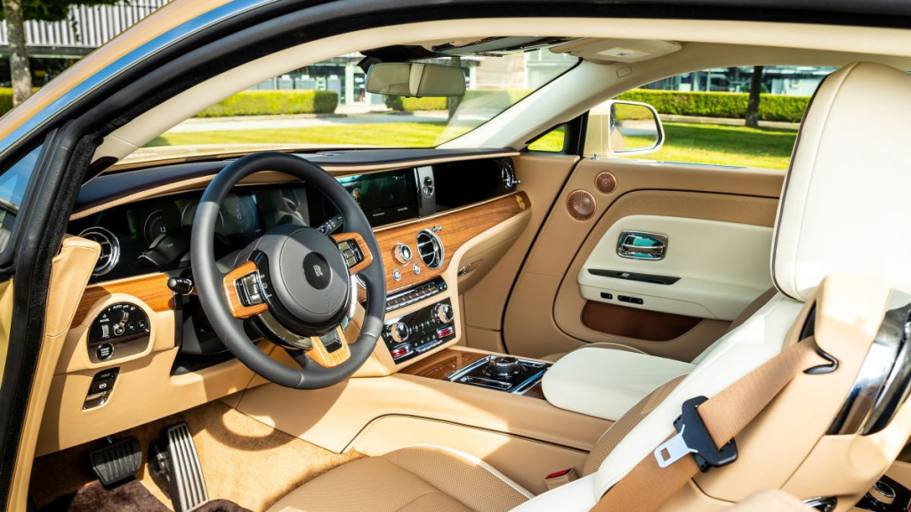 Відбитки собачої лапи прикрашають декоративну дерев’яну вставку на передній панелі та накладки з рожевого золота на порогах. Інтер’єр має комбіноване оздоблення світлою та темною шкірою.