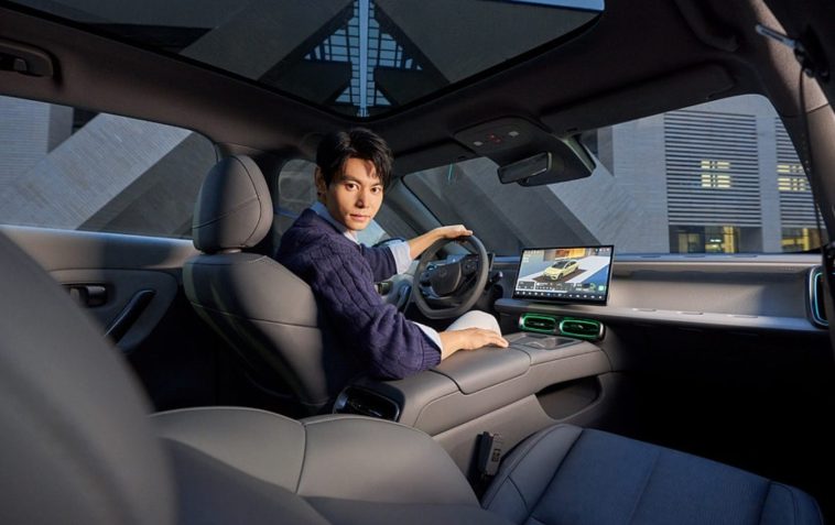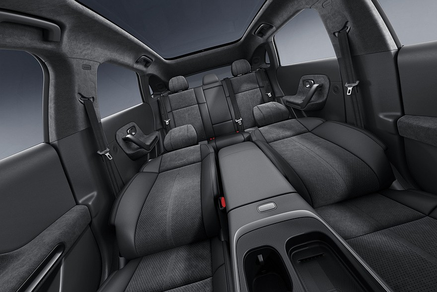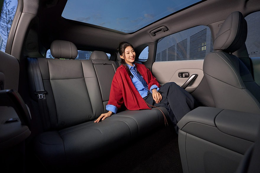 Двоярусний центральний тунель – такий же, як у електроседана B01. На тунелі знаходяться майданчик для бездротової зарядки та пара неприкритих підсклянників. В обробці інтер’єру хетчу можуть бути використані шкіра або замша.