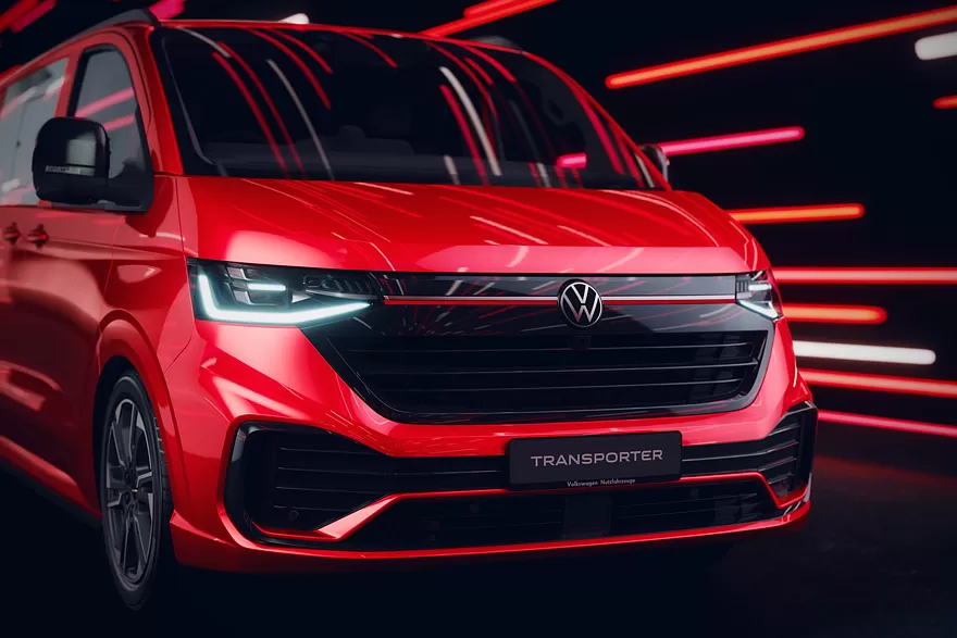 Transporter Sportline отримав більш агресивно оформлену передню частину. Моделі дісталися глянсові чорні радіаторні грати з червоною тонкою лінією, що проходить між фарами, по центру розташований великий логотип бренду.