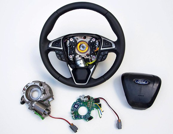 Интереснейший подход к системе изменяемого передаточного отношения рулевого механизма продемонстрировала компания Ford. Инженеры подсоединили к рулевому валу электромотор, который при необходимости обострить руль просто доворачивает колеса на нужный угол пропорционально движениям водителя, а значит — незаметно. Само по себе это не новость — примерно так же работали первые системы, устанавливаемые на BMW. Важно другое: инженеры Ford разместили электродвигатель прямо в ступице руля. Удивительно, как им удалось установить в рулевом колесе и мотор, и подушку безопасности, и органы управления мультимедиа и круиз-контролем.