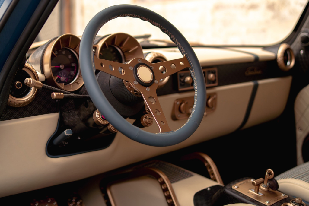 Інтер’єр виглядає ще стильніше, ніж зовнішність. Машина отримала особливі прилади з матово-золотистою окантовкою, оброблене синьою шкірою триспицеве кермо і оригінальні перемикачі на рульовій колонці.