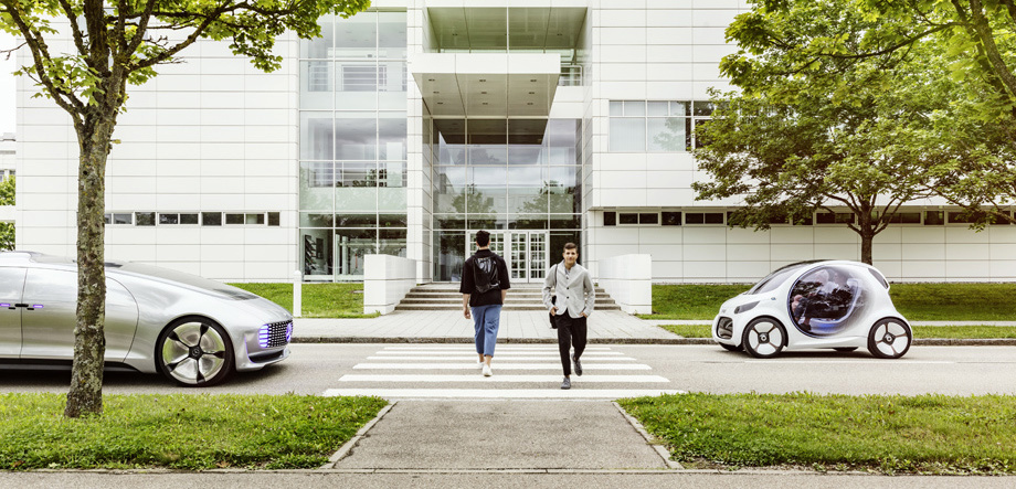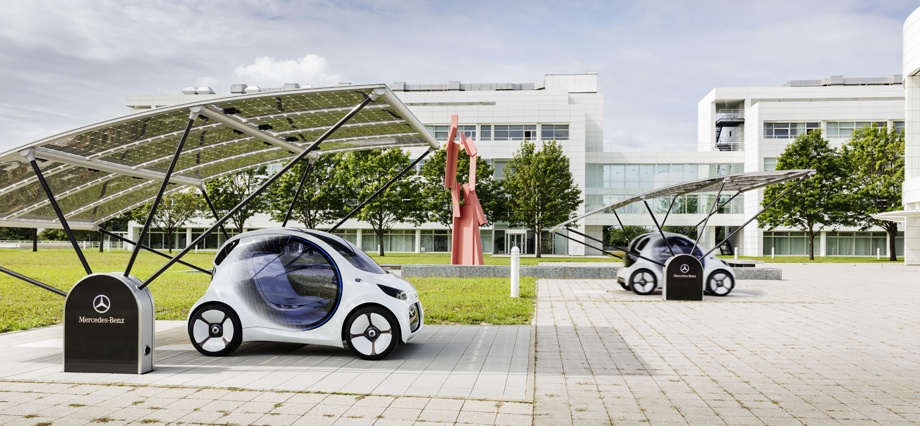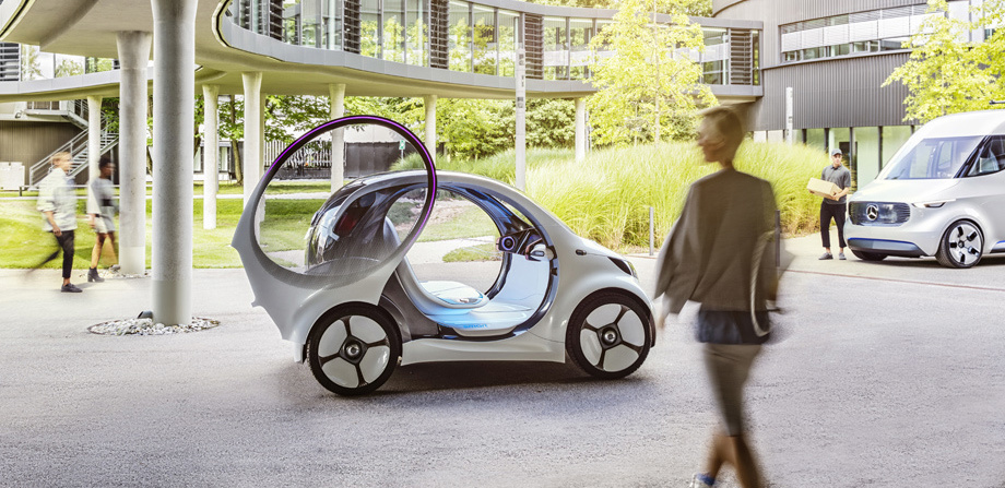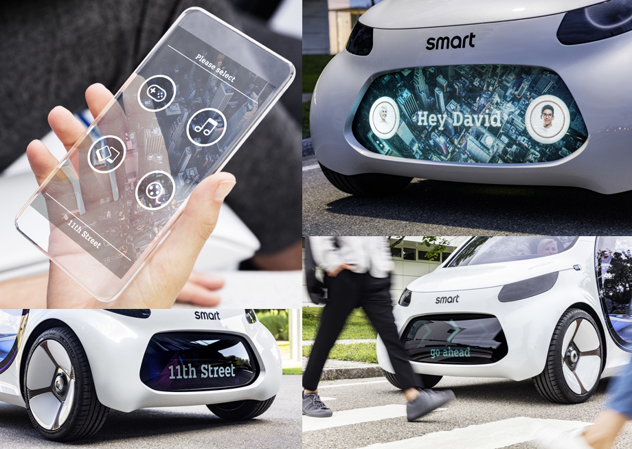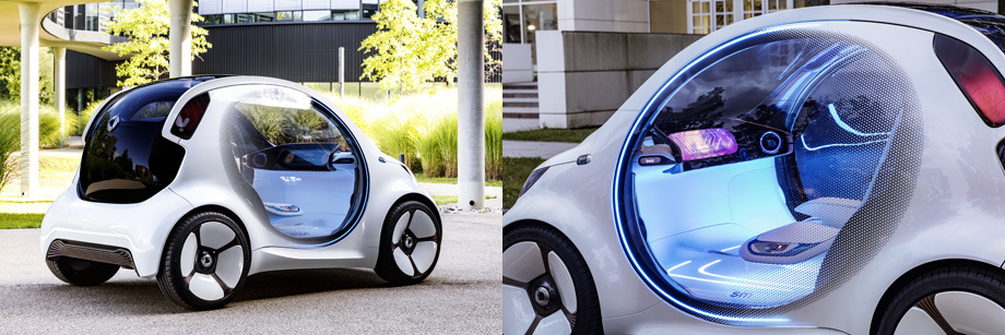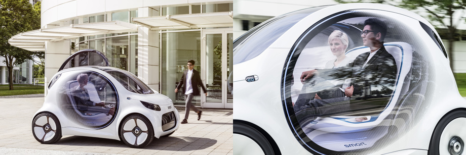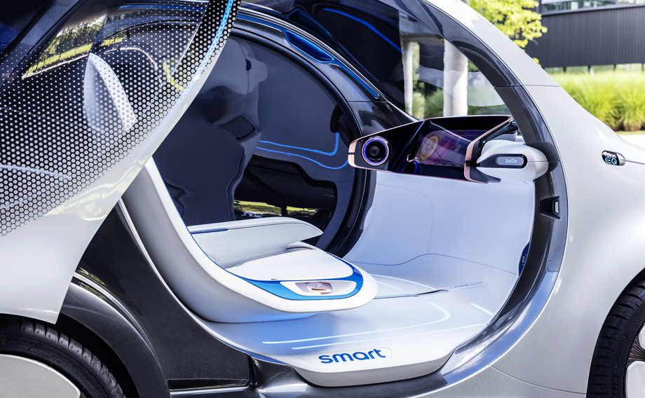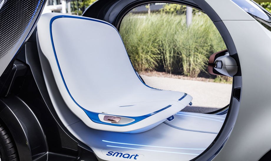 Двухместный электромобиль, лишённый руля и педалей, по габаритам близок к серийному Smart fortwo. Салон отделан светлой кожей, которую легко чистить, а сиденье может либо разделяться подлокотником на два сегмента, либо представлять собой монолитный диван. Управление беспилотником осуществляется с помощью голосовых команд или личных мобильных гаджетов. Автомобиль создавали для служб проката в будущем. Искусственный интеллект сможет получать информацию о пассажирах из социальных сетей и персонализировать авто под них.