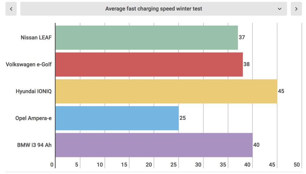 Ampera-e может похвастаться самым большим аккумулятором и самый большим заявленным запасом хода, в то время как у Ioniq Electric аккумулятор самый маленький. Но, как оказалось, запас хода у Ioniq был схож с другими автомобилями (за исключением Ampera-e), несмотря на то, что он оснащен значительно меньшим аккумуляторным блоком.