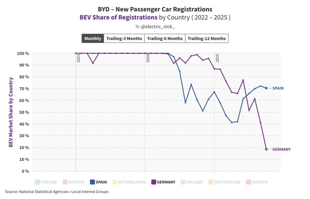 В Іспанії все зовсім інакше – частка електромобілів китайського бренду у статистиці продажів ніколи не падала нижче 40% і нещодавно знову піднялася до приблизно 70%.
