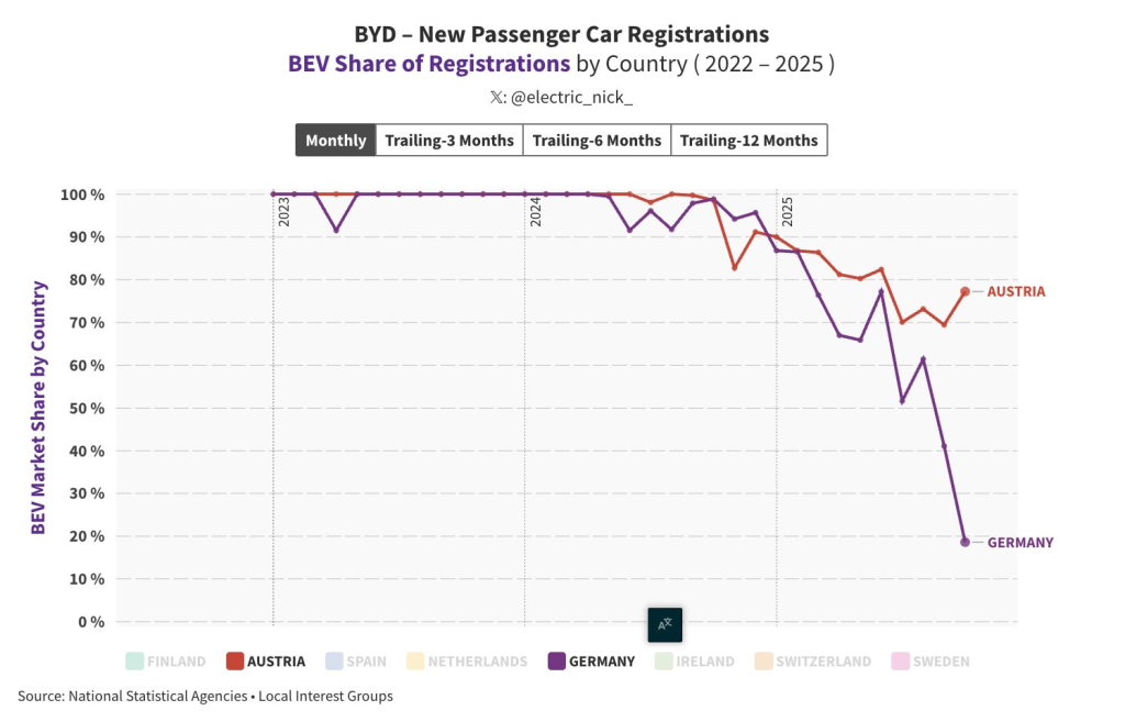 Фактично, у жовтні частка електромобілів серед продажів BYD впала до лише 18,6%, вперше опустившись нижче середнього показника по Німеччині.