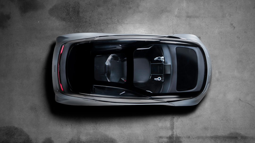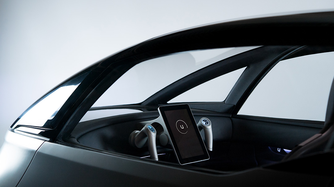 Пассажир сидит за водителем, который смотрит на планшетоподобный дисплей в двойного “джойстикового” руля и обладает хорошей видимостью благодаря относительно большому ветровому стеклу.