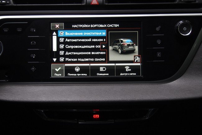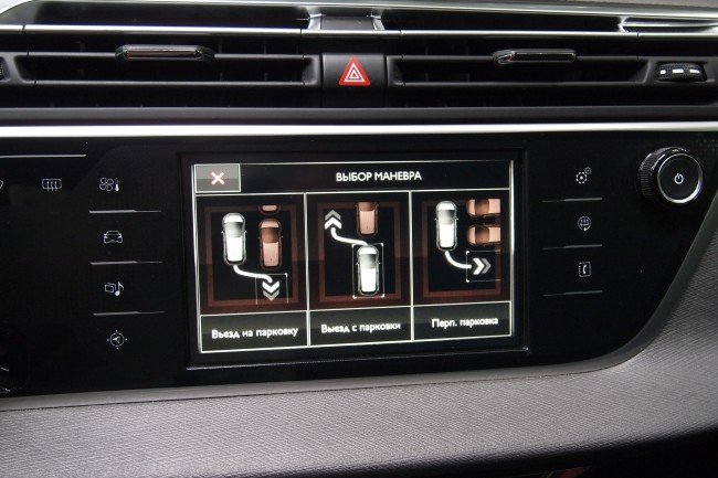Кстати, обратили внимание на дисплей и виртуальные кнопки парковщика? Это еще одна инновация в CitroenC4 Picasso: все функции управляются через 7-дюймовый сенсорный дисплей, установленный в центре передней панели. Этот дисплей развязал руки и проектировщикам интерьера, и техническим инженерам: первые сумели создать стильный салон, а вторые ввели все необходимые функции без нагромождения кнопок. Хотя кнопки также остались, но они сенсорные, собраны вокруг дисплея, и открывают доступ к каждому функциональному разделу: климат-контроль; функции автомобиля; аудиосистема; навигация; различные настойки; сервис CitroenMulticity; телефон.