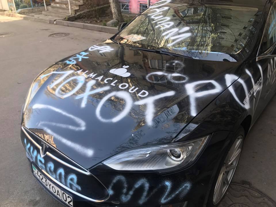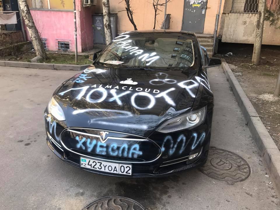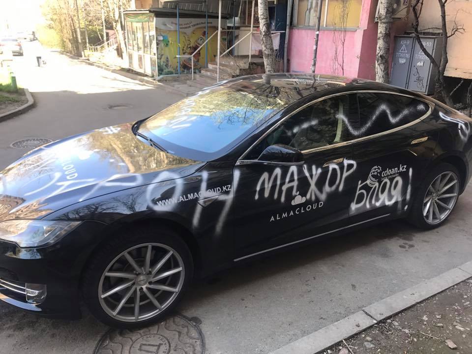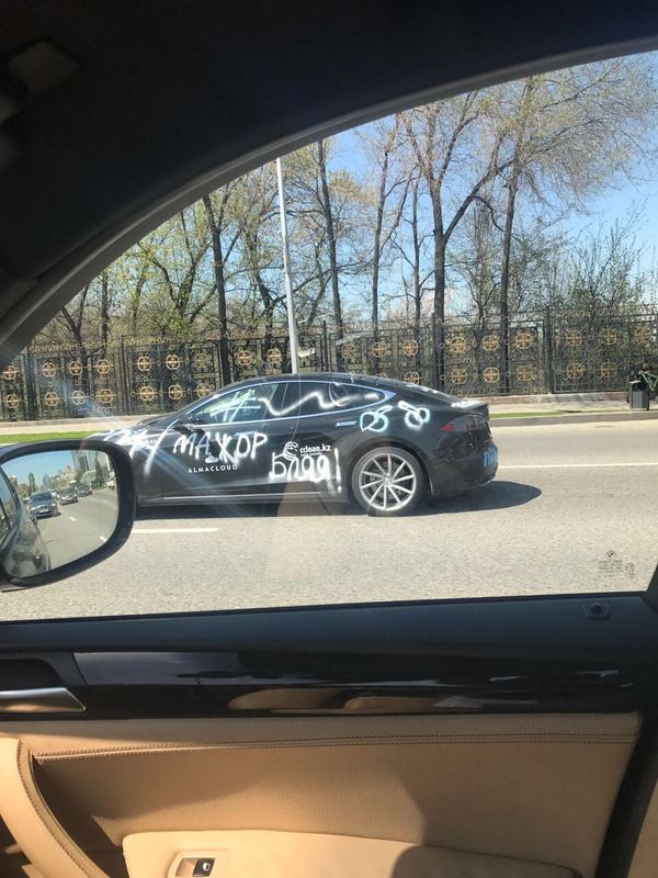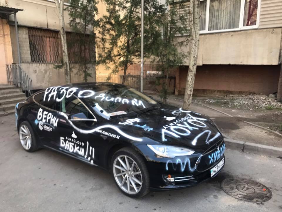 Tesla-*уесла: В Алматы вандалы разрисовали призовой электрокар