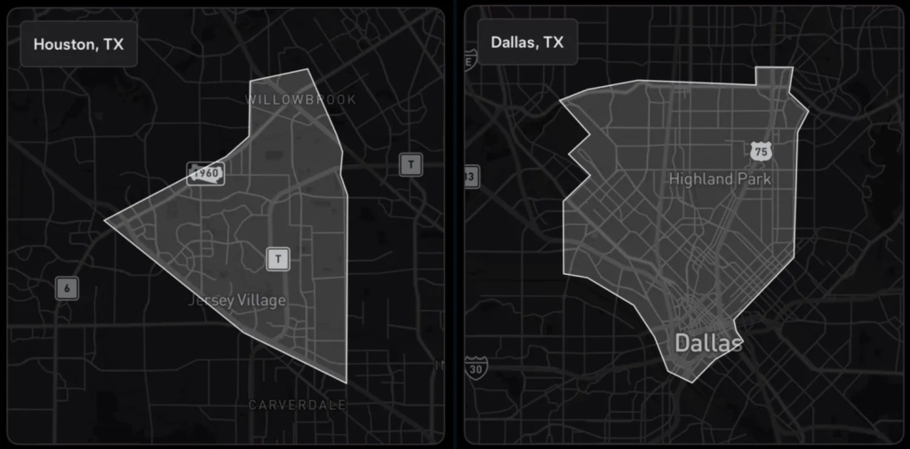 Геозона Х’юстона охоплює приблизно 25 квадратних миль, згідно з попереднім аналізом карт користувачами, тоді як зона Далласа, схоже, зосереджена навколо району Хайленд-Парк. Для контексту, геозона Tesla в Остіні зросла приблизно до 245 квадратних миль після місяців поступового розширення, але знадобився майже рік, щоб розширитись з початкової площі в 20 квадратних миль.