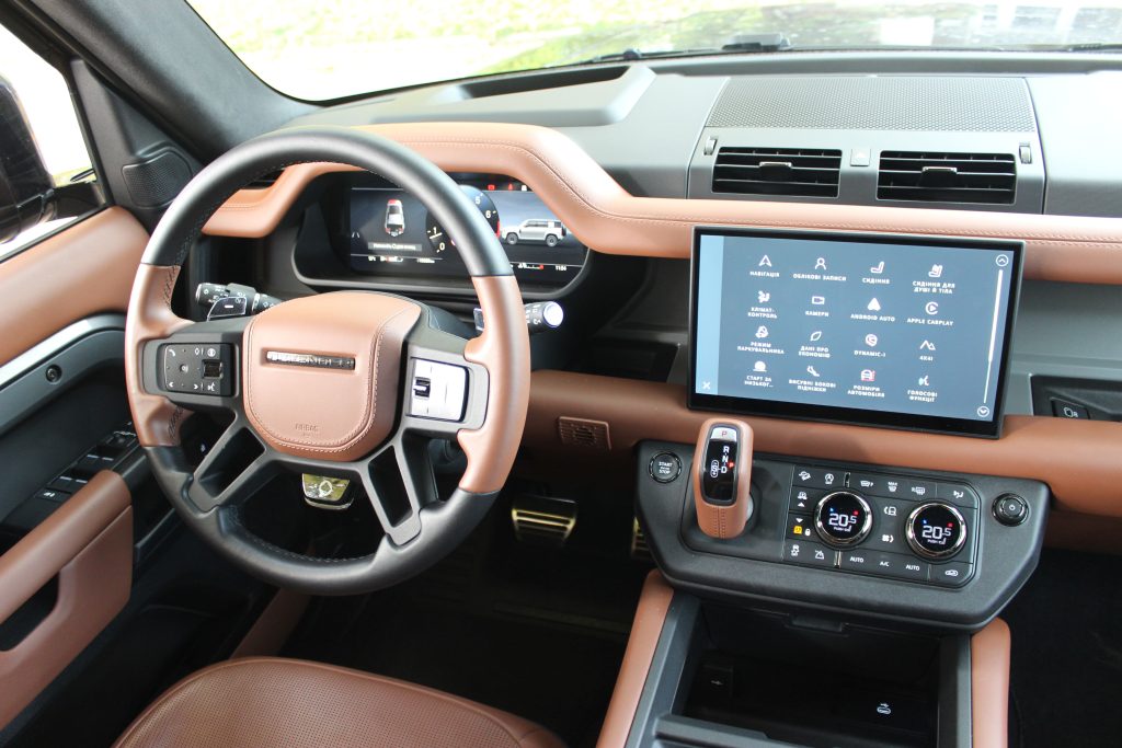 Попри брутальність, у британському позашляховику можна комфортно подорожувати вчотирьох. Класичні віконця-бійниці залишені для антуражу. Але дивитися в них можна, лише копирсаючись у багажному відсіку. Готовність до далеких поїздок виявляється зокрема кількістю розеток різного типу. Їх по всій машині більше десяти.