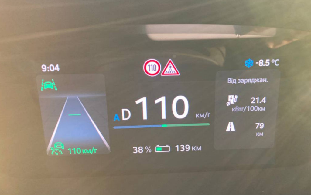 Загалом, у мороз по трасі на швидкості 105-110 км/год машина споживає близько 21 кВт*год. При цьому у сильний снігопад та зустрічний вітер до витрати легко додаються 1-2 кВт*год.