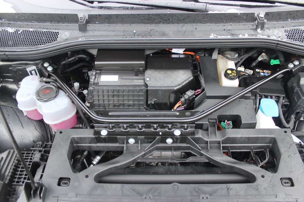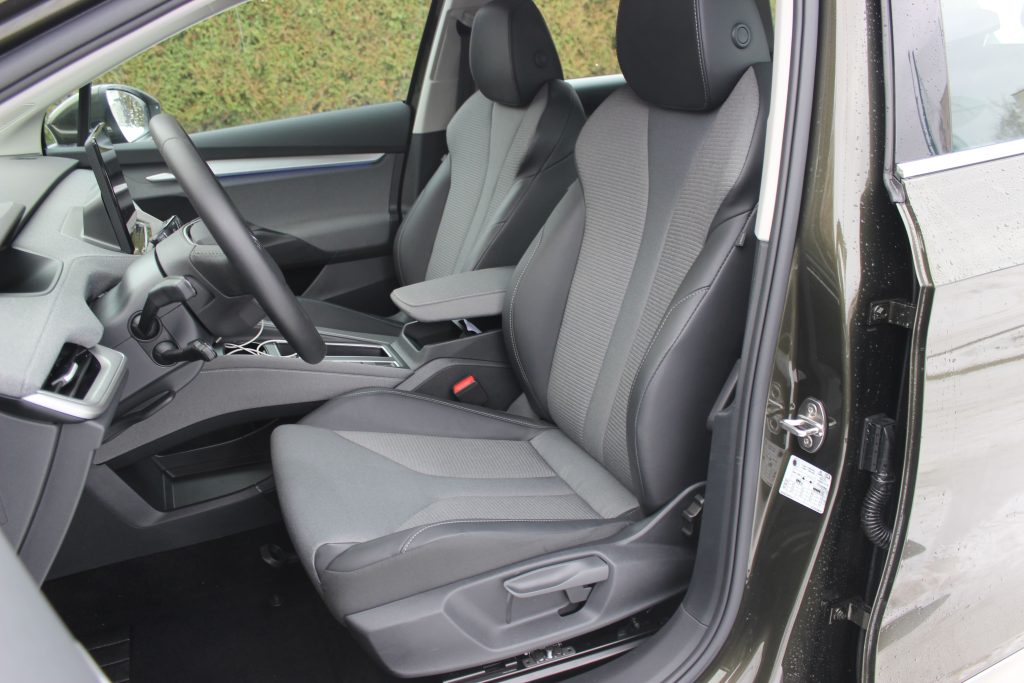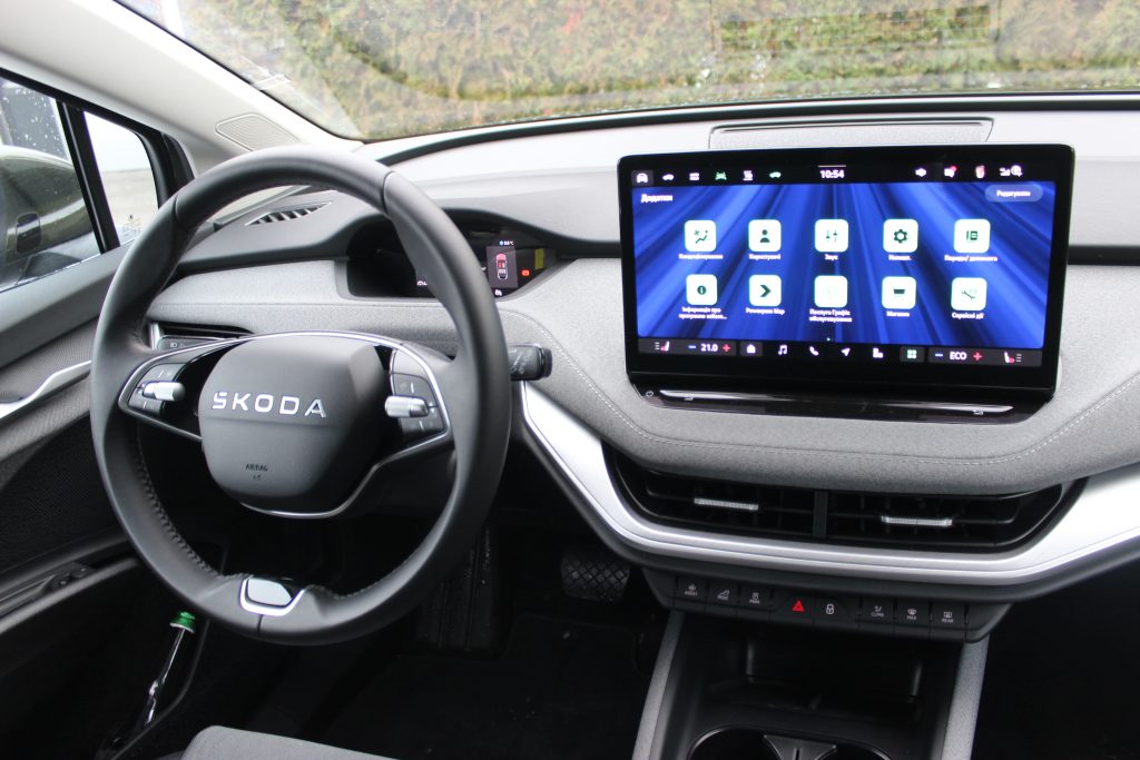 Приємно, що електричний кросовер продовжує фірмову філософію “simply clever”: у кишені водійських дверей за традицією захована парасолька, на центральній консолі та в підлокітнику є бокси для дріб’язку, на передній стійці передбачений тримач для паркувальних талонів, а в багажнику можна знайти скребок для льоду.