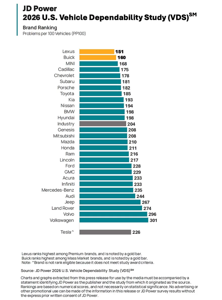 У рейтингу надійності брендів Lexus та Buick, як і минулого року, посіли перші два місця. Однак, обидва лідери не побачили покращення своїх балів за шкалою PP100: бал Lexus становив 140, піднявшись до 151, тоді як бал Buick становив 143, піднявшись до 160.