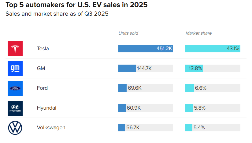 Лідер індустрії електромобілів США Tesla, за оцінками, зберегла свою лідерську позицію з часткою ринку 43,1% до вересня. Це менше, ніж 49% на кінець минулого року, оскільки конкуренти продовжують випускати нові електромобілі.