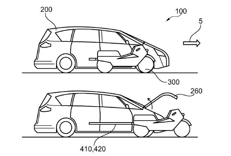 В патенте отмечается, что мотоцикл “снабжен электродвигателем и может ездить самостоятельно”. Байк и легковой автомобиль могут также использоваться независимо друг от друга. Батарея мотоцикла будет подключена к основному автомобилю, который в патенте описан либо как плагин-гибридный, либо полностью электрический.