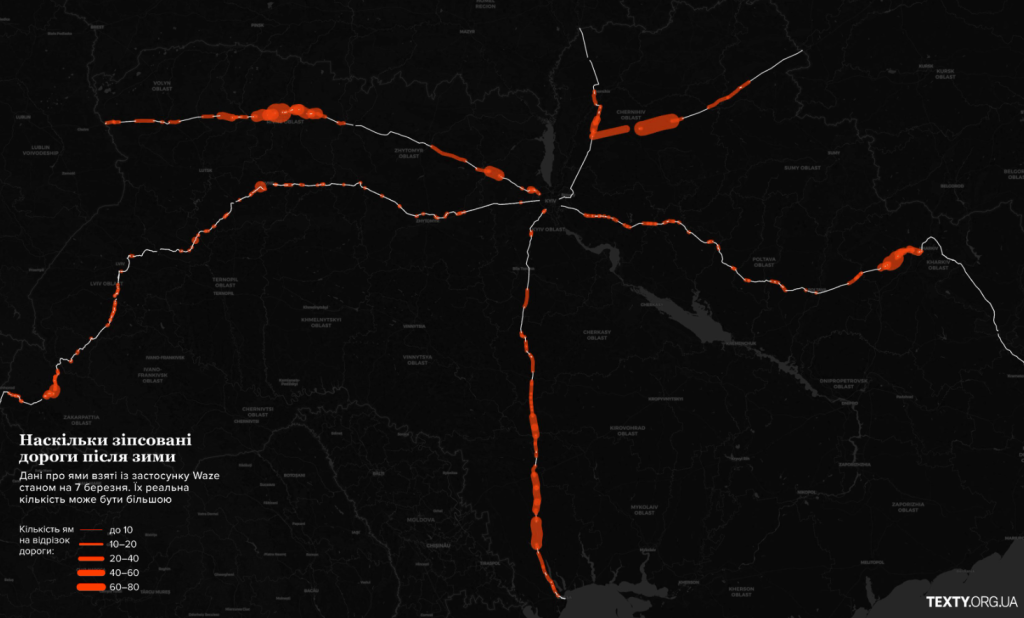Журналісти Texty.org.ua на основі даних з навігаційного застосунку Waze створили онлайн-мапи вибоїн на дорогах.