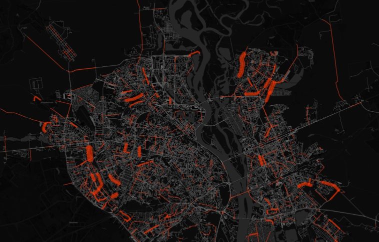 Карта показує, що ями з’являються не поодинці, а цілими сегментами. У деяких місцях їх десятки, що свідчить про руйнування верхнього шару асфальту на чималих ділянках, а не про поодинокі дефекти покриття.