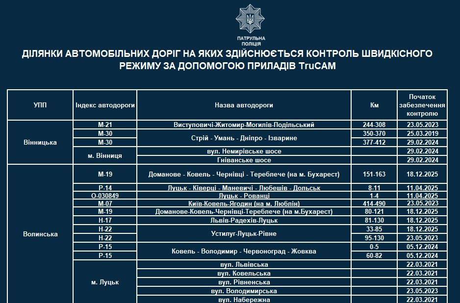 В Україні патрульна поліція розширила використання приладів TruCAM, запровадивши контроль швидкості ще на 14 додаткових відрізках доріг і вулиць у населених пунктах. Усього перевірка швидкісного режиму здійснюватиметься на 335 ділянках по всій країні.