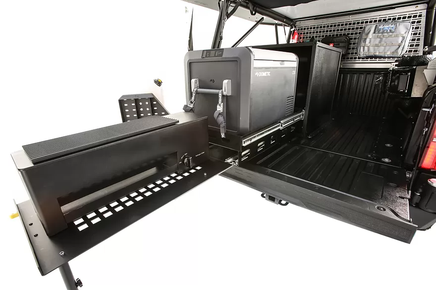 Кузов авто оснащений кунгом, виготовленим із переробленого карбону. На боковинах кунга розмістилися дошки-підкладки під колеса. Перед експедиційним багажником встановлена світлодіодна люстра, складена з семи круглих фар.