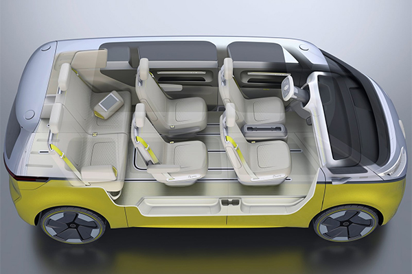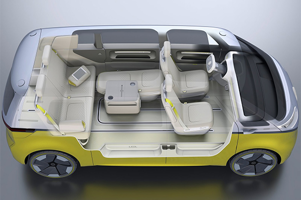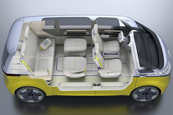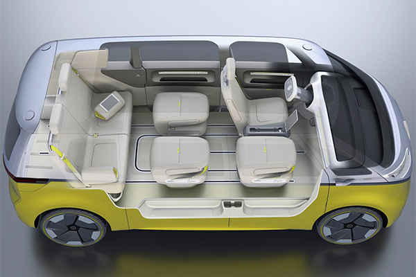 I.D. Buzz укомплектовали тремя рядами кресел. Передние сиденья могут разворачиваться против хода движения во время езды на автопилоте, кресла второго ряда трансформируются в столики, а третьего — в кровать.