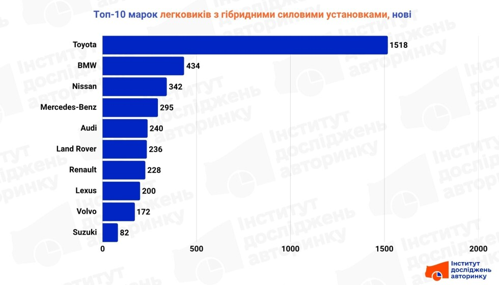 Рейтинг також свідчить про високий інтерес до преміум-сегмента. У топ-10 увійшли чотири німецькі та один японський преміальний бренд: Audi, BMW, Mercedes-Benz та Lexus. Honda, Hyundai та KIA також забезпечують стабільний попит, пропонуючи перевірені та доступніші гібридні рішення для масового споживача.