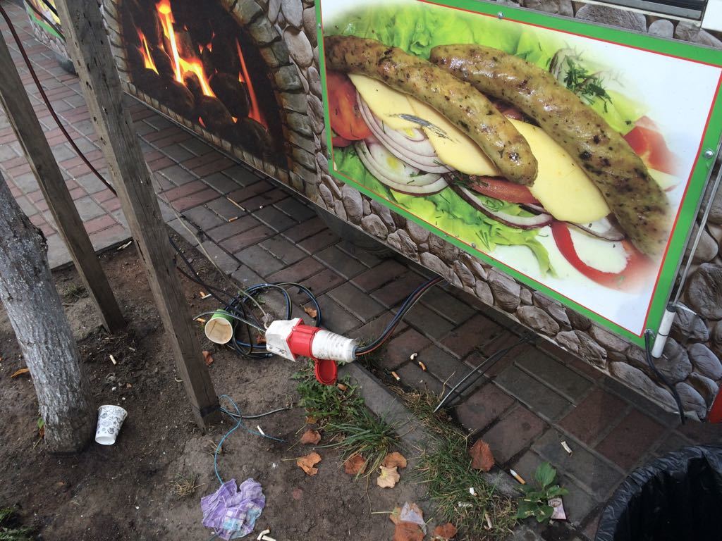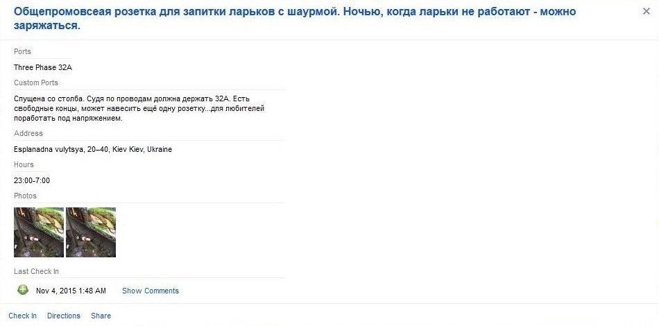 Попадаются на карте Киева и весьма «экзотичные» электрозаправки, например, на улице Эспланадная, 20-40. Данная электрозарядка больше похожа на спущенный со столба для подключения объектов торговли кабель, который электромобилисты используют не по назначению: для зарядки своих электромобилей. Такое ощущение, что люди купившие электромобиль за десятки тысяч долларов, будут специально искать подобные места для зарядки своего электрокара. Такие точки, на наш взгляд, только дискредитируют карту PlugShare.