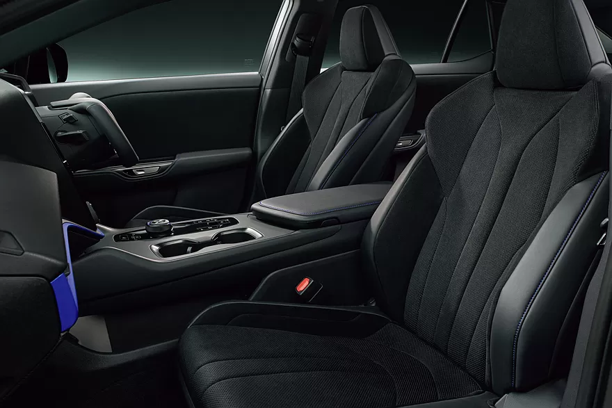 Lexus RZ 600e F Sport Performance отримав 21-дюймові матово-чорні легкосплавні колісні диски Enkei, за якими можна побачити сині шестипоршневі алюмінієві моноблочні супорти спереду. Ще новій версії на 20 мм занизили підвіску в порівнянні з RZ 550e F Sport. У салоні встановлено штурвал замість звичного кермового колеса, а також є синій декор.